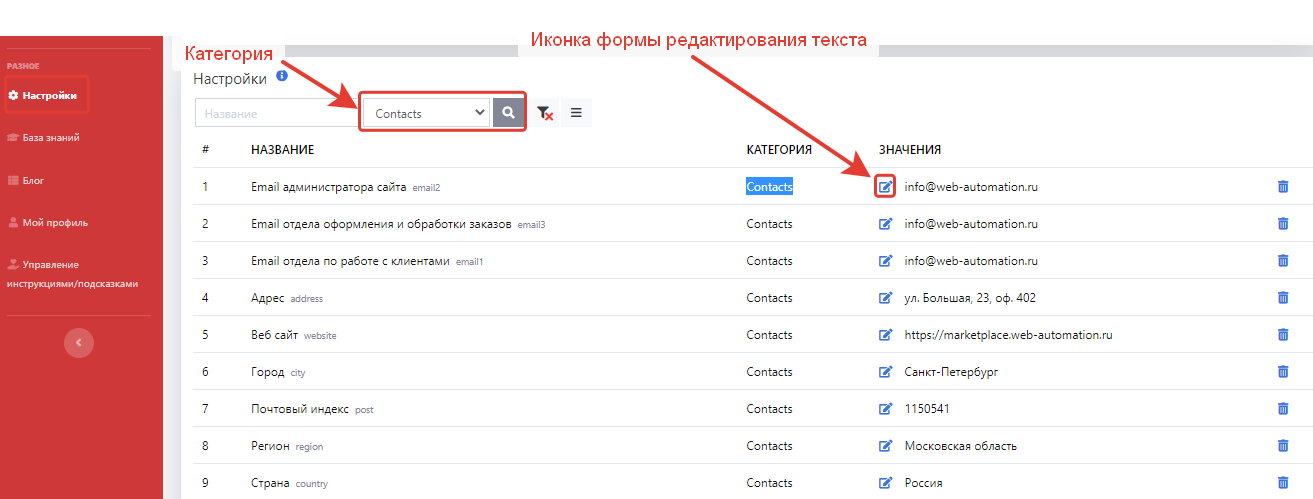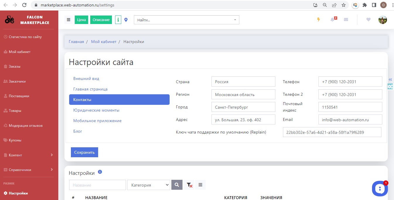 В кабинете администратора на странице Настройки есть раздел для редактирования страницы Контакты.