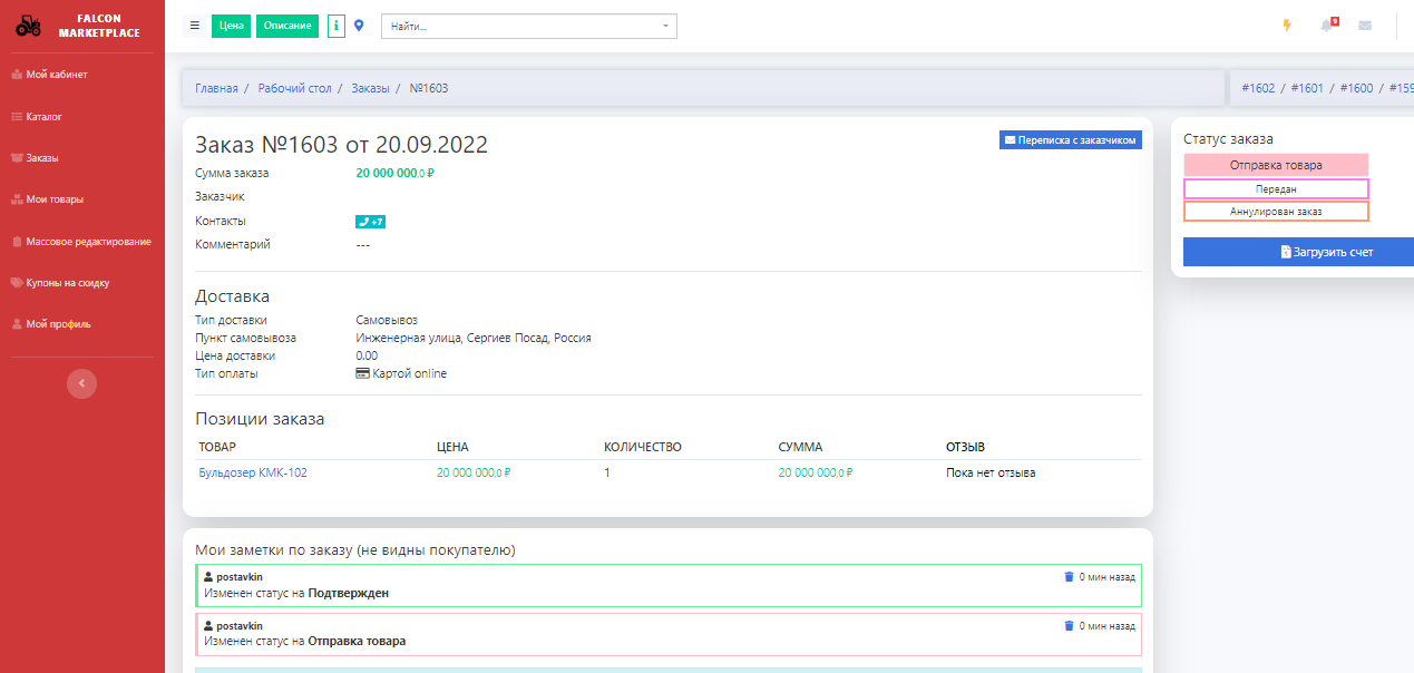 Сводная таблица заказов находится в кабинете администратора в разделе Заказы. Администратор может редактировать тип оплаты, пункт самовывоза, цену доставки, отправлять заметки поставщику и взаимодействовать с покупателем.