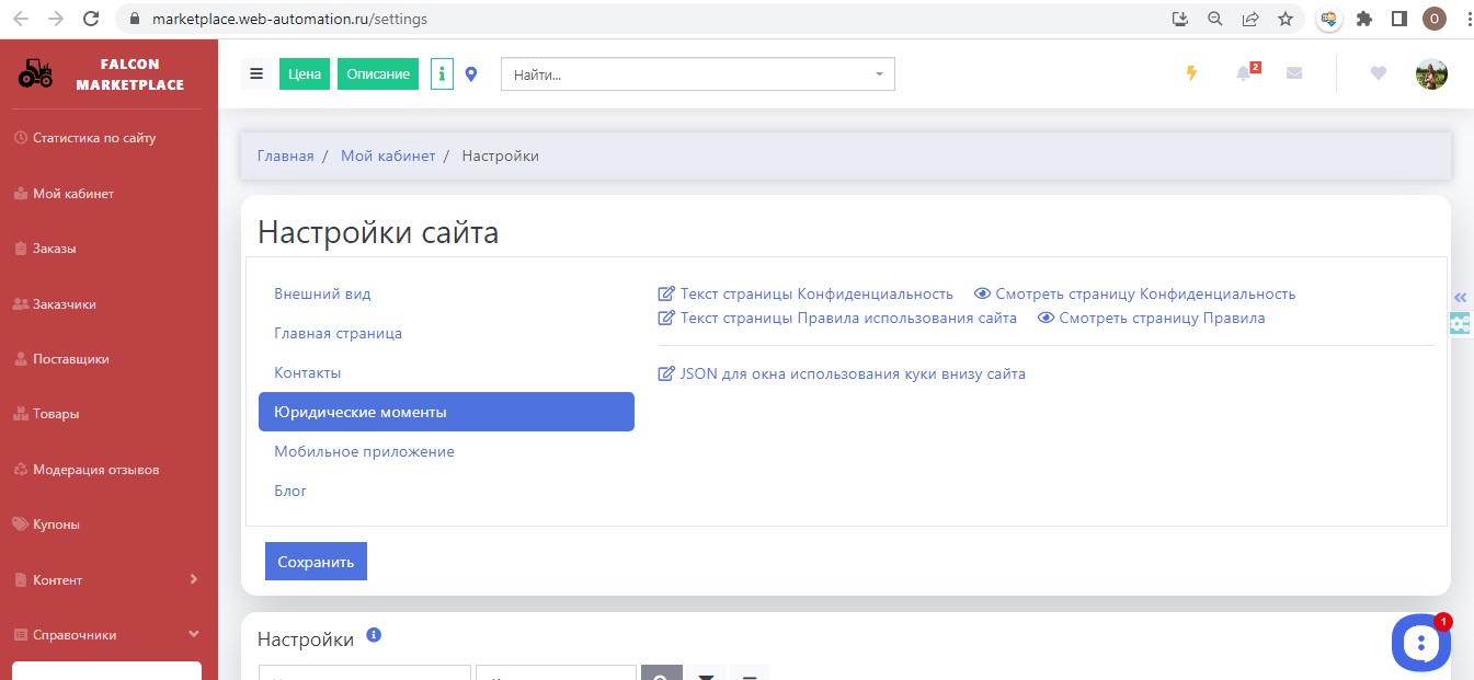 В разделе Настройки в кабинете администратора выбираем раздел Юридические моменты.
