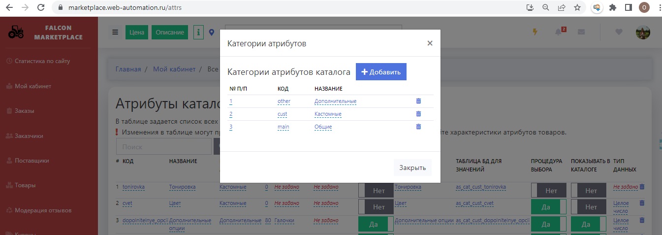На странице Атрибуты каталога можно добавить/редактировать/удалить атрибут какой-либо категории.