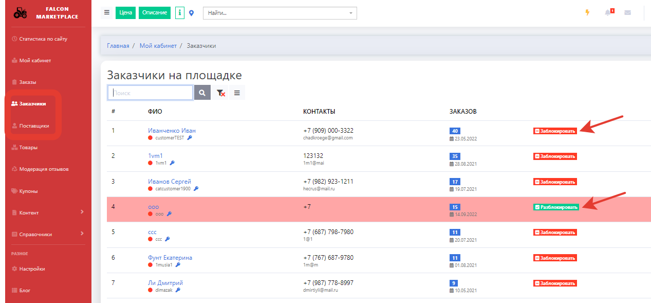 Администратор может заблокировать/разблокировать покупателя или поставщика в своем кабинете.