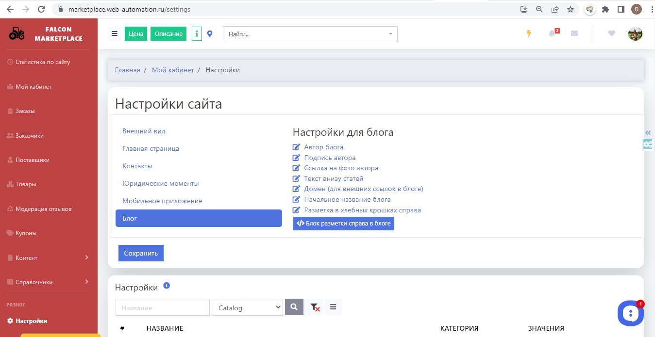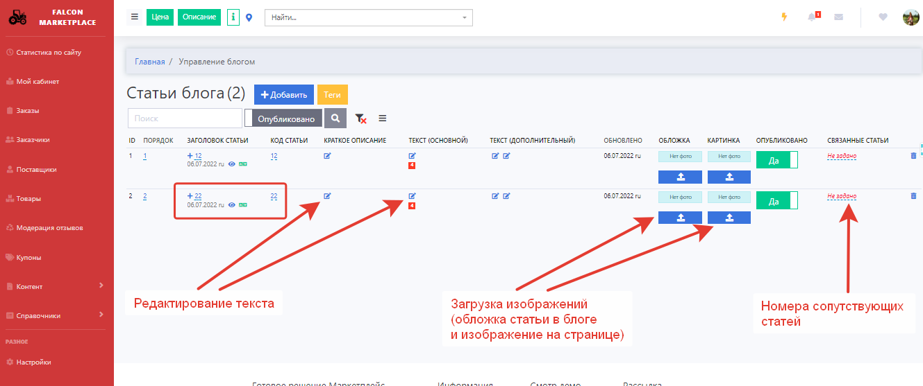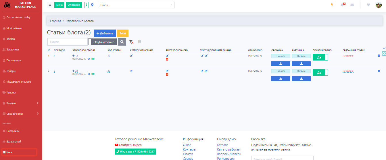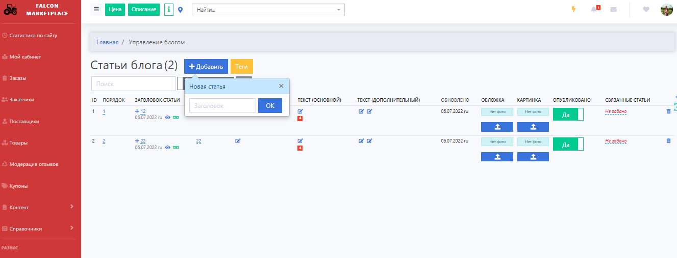 Для управления блогом (добавления/редактирования статей) переходим в раздел Блог, в кабинете администратора.