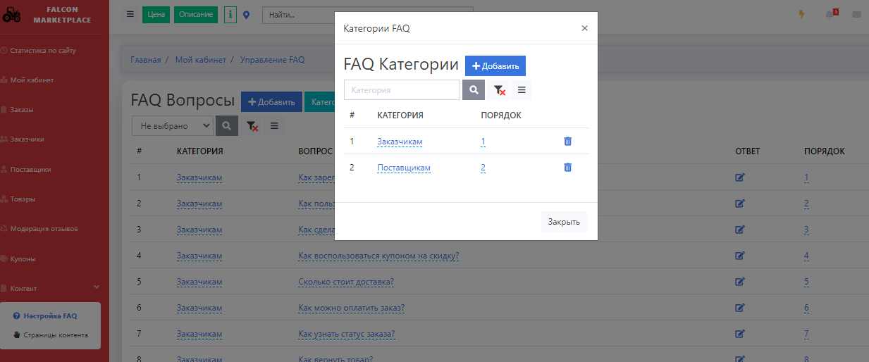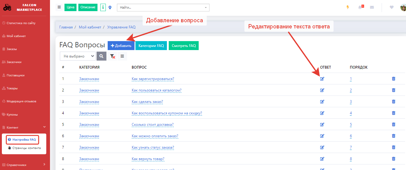 Управление страницей Вопросы и ответы для пользователей (FAQ)