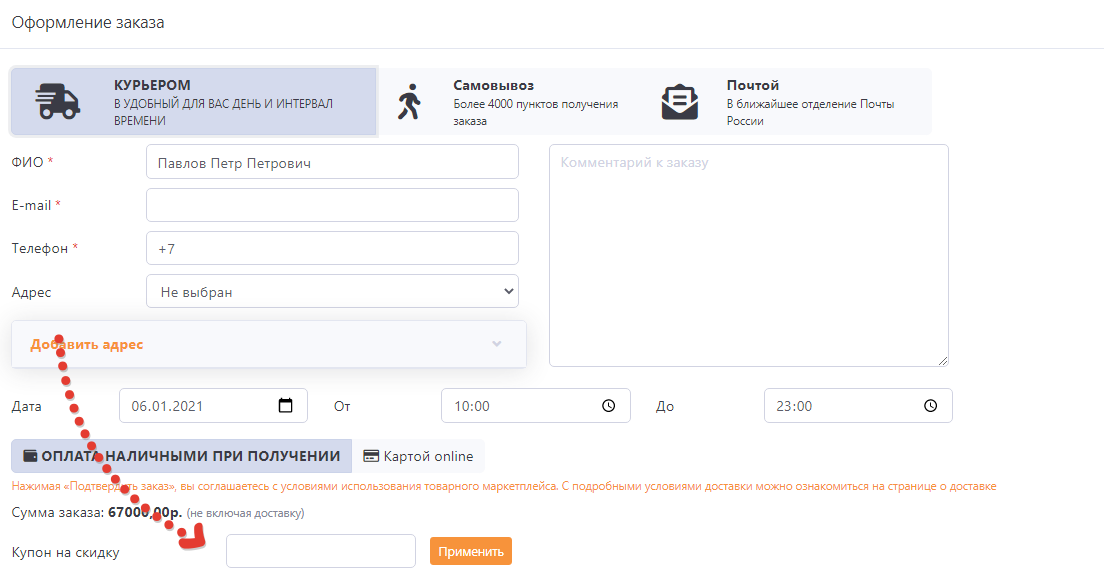 Внизу формы Оформление заказа есть поле для ввода купона. После введения данных сумма заказа будет автоматически пересчитана.