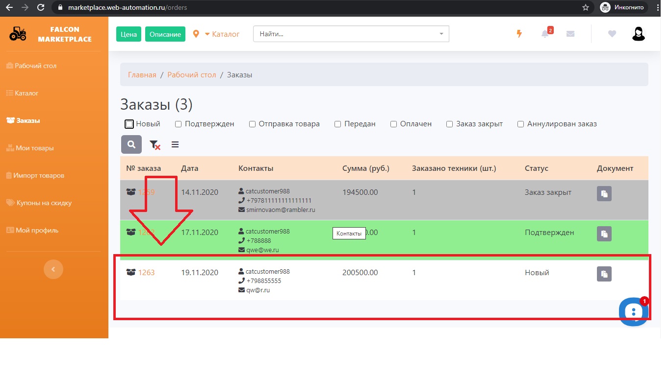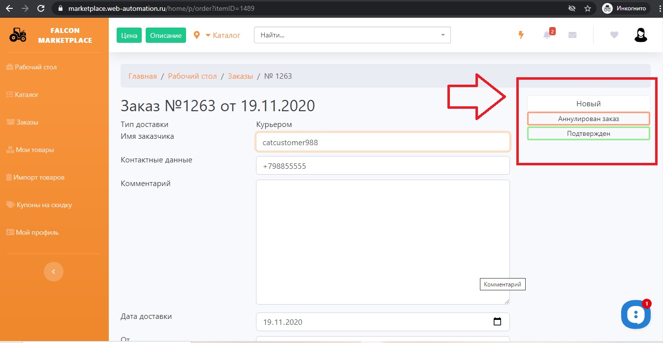 После того, как покупатель оформил заказ какого-либо Вашего товара, Вы получите уведомление. Заказ станет доступен во вкладке Заказы со статусом Новый.